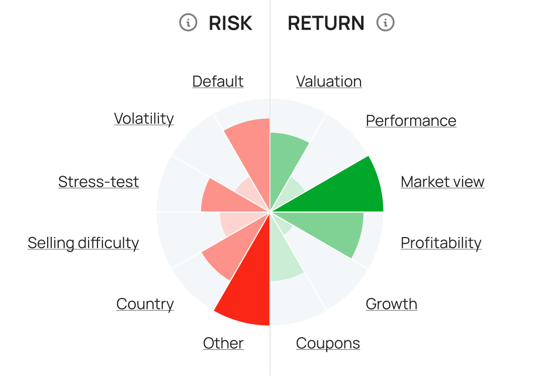 For bonds, InvestWatch follows a similar logic. Valuation benchmarks the bond against the peers, i.e., the peers with similar risk profiles and denominated in the same currency. Performance measures the bond’s price performance against the peers considering its relative valuation. Market view compares the bond’s fair spread implied by the bonds with a similar risk profile and in the same currency to its existing spread. Profitability and Growth sections are identical to those for stocks, though here, these relate to both the issuer and the guarantor. The Coupons section deals with coupon payments and their characteristics. In terms of risks, these are very similar to the sections for stocks, except here, InvestWatch considers the risks of both the issuer and the guarantor, and the Other risks section includes more parameters (subordination and its degree, embedded options, etc.).