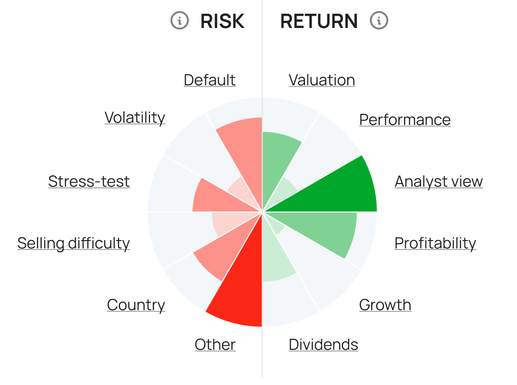 For stocks, return factors cover all fundamental investment paradigms: value investing (Valuation), medium-term price swing investing (Performance), prominent analyst following (Analyst view), investing in solid companies (Profitability), growth investing (Growth), and dividend seeking (Dividends). Although these are usually considered separate and even competing investing schools, all six are critical for understanding the return potential for any stock. Risk factors cover essential risk factors: credit risk (Default risk), market risk (Volatility and Stress-test), liquidity risk (Selling difficulty), country & infrastructure risks (Country risks), and many other risks (Other risks). Again, all six are critical to understanding the risk profile of a stock.